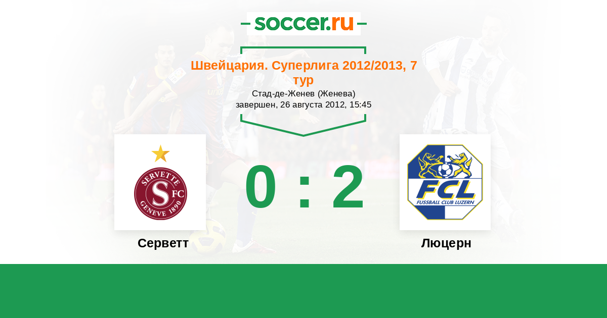 Швейцария. Суперлига 04.11.2012 Люцерн Логотип футбольный клуб Люцерн 1:1 Логотип футбольный клуб Серветт (Женева) Серветт