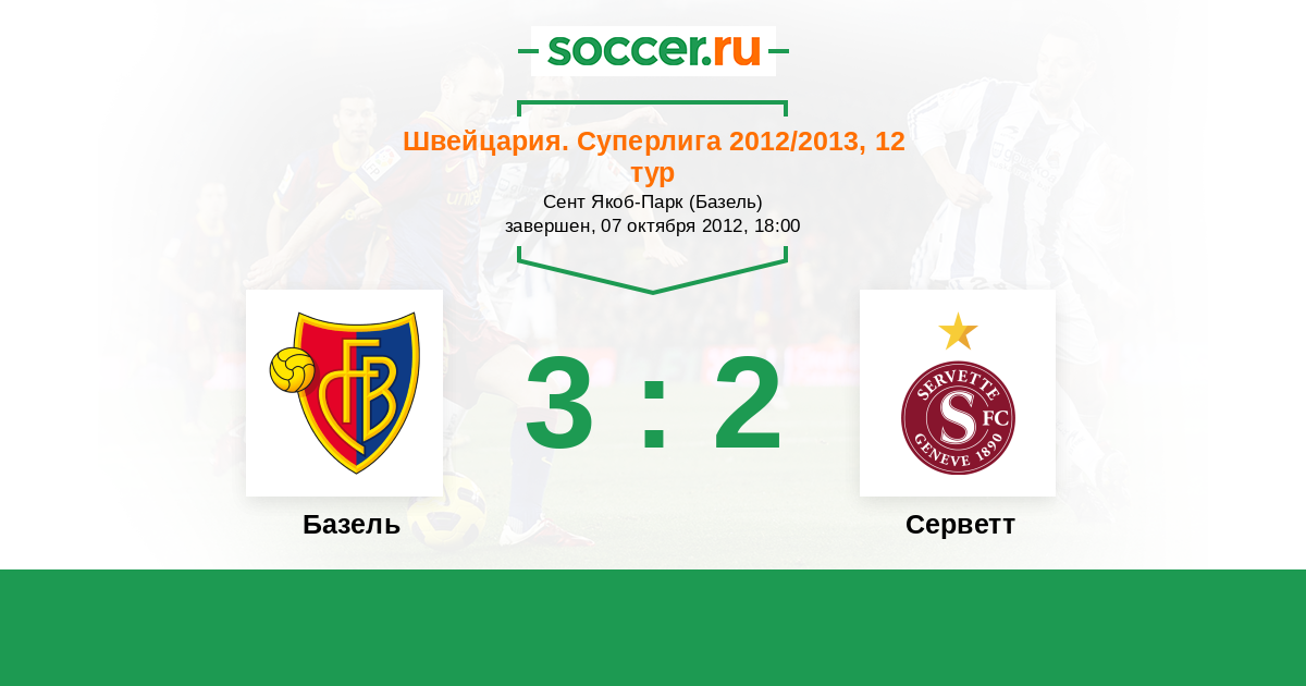 Швейцария. Суперлига 13.07.2012 Серветт Логотип футбольный клуб Серветт (Женева) 0:1 Логотип футбольный клуб Базель Базель