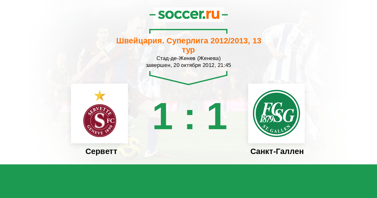 Швейцария. Суперлига 13.04.2013 Серветт Логотип футбольный клуб Серветт (Женева) 1:3 Логотип футбольный клуб Санкт-Галлен Санкт-Галлен