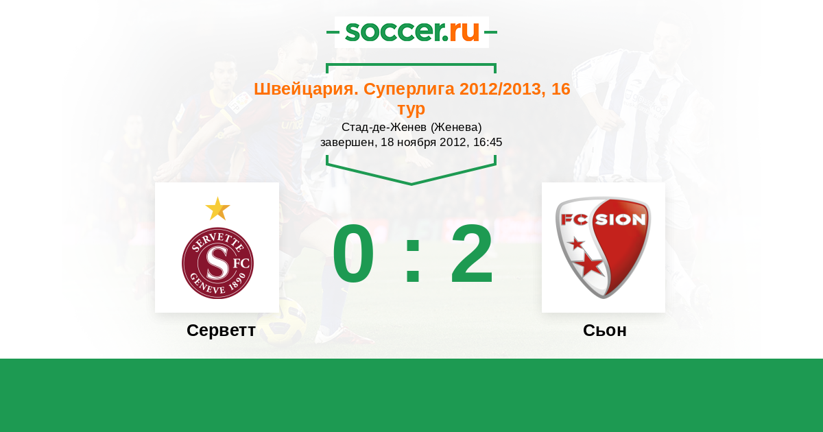 Швейцария. Суперлига 26.02.2012 Сьон Логотип футбольный клуб Сьон 0:1 Логотип футбольный клуб Серветт (Женева) Серветт