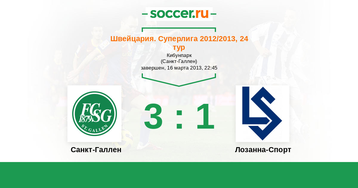 Швейцария. Суперлига 20.04.2013 Лозанна-Спорт Логотип футбольный клуб Лозанна-Спорт 1:3 Логотип футбольный клуб Санкт-Галлен Санкт-Галлен