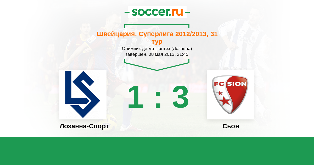 Швейцария. Суперлига 10.03.2013 Сьон Логотип футбольный клуб Сьон 0:1 Логотип футбольный клуб Лозанна-Спорт Лозанна-Спорт