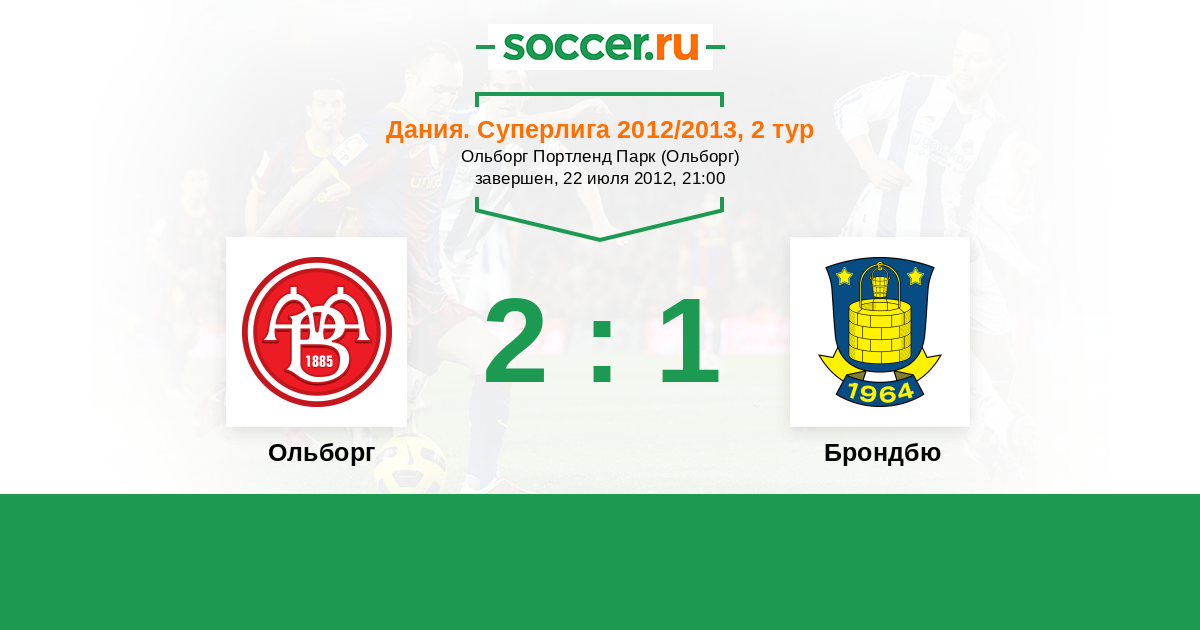 Дания. Суперлига 07.10.2012 Брондбю Логотип футбольный клуб Брондбю (Брённбю) 1:3 Логотип футбольный клуб Ольборг Ольборг