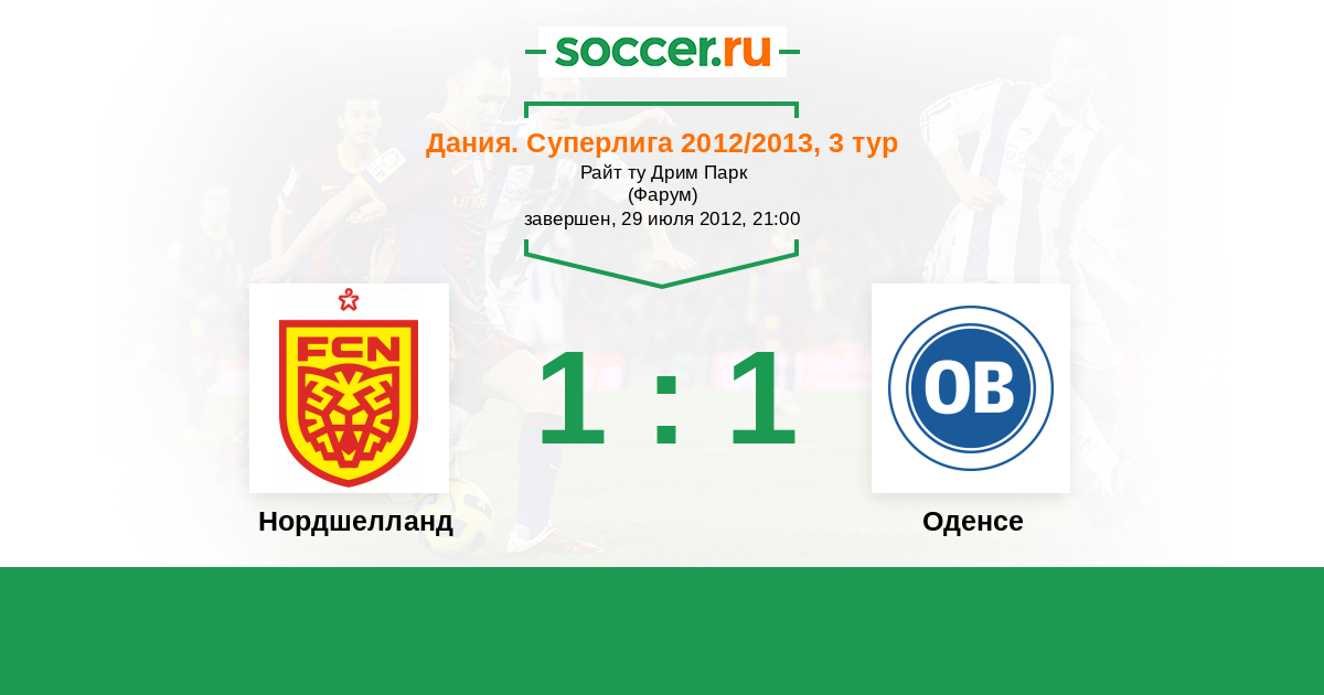 Дания. Суперлига 05.10.2012 Оденсе Логотип футбольный клуб Оденсе 3:0 Логотип футбольный клуб Нордшелланд (Фарум) Нордшелланд