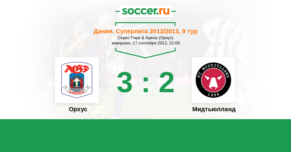 Дания. Суперлига 12.09.2011 Орхус Логотип футбольный клуб Орхус 4:2 Логотип футбольный клуб Мидтьюлланд (Хернинг) Мидтьюлланд