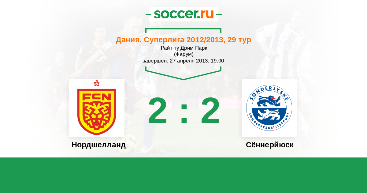 Дания. Суперлига 03.11.2012 Сённерйюск Логотип футбольный клуб Сённерйюск (Хадерслев) 1:2 Логотип футбольный клуб Нордшелланд (Фарум) Нордшелланд