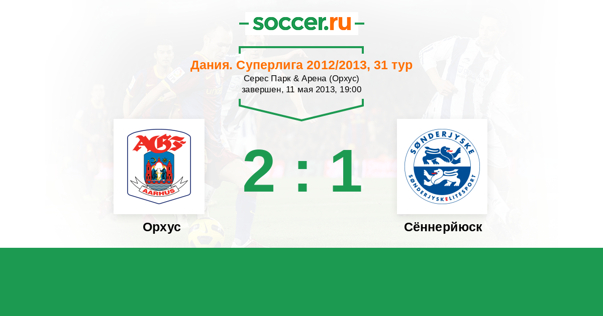 Дания. Суперлига 21.09.2012 Орхус Логотип футбольный клуб Орхус 2:2 Логотип футбольный клуб Сённерйюск (Хадерслев) Сённерйюск
