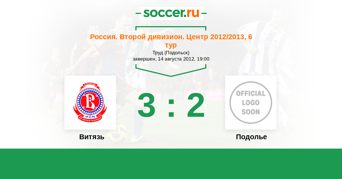 Россия. Вторая лига. Группа 3 16.08.2014 Подолье Логотип футбольный клуб Подолье (Подольский район) 2:1 Логотип футбольный клуб Витязь (Подольск) Витязь