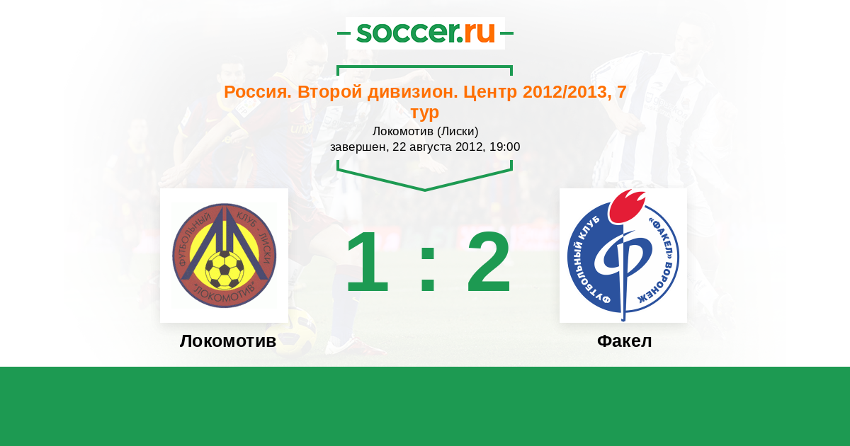 Россия. Кубок 05.08.2012 Локомотив Логотип футбольный клуб Локомотив (Лиски) 0:2 Логотип футбольный клуб Факел (Воронеж) Факел