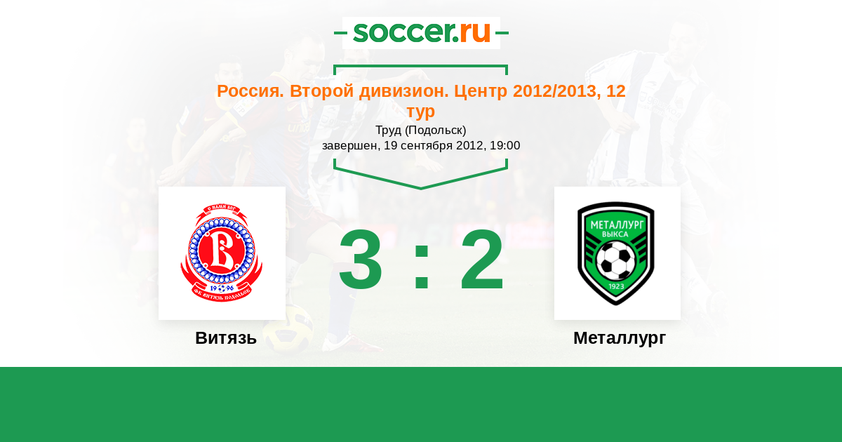 Россия. Вторая лига. Группа 3 19.09.2013 Металлург Логотип футбольный клуб Металлург (Выкса) 0:1 Логотип футбольный клуб Витязь (Подольск) Витязь