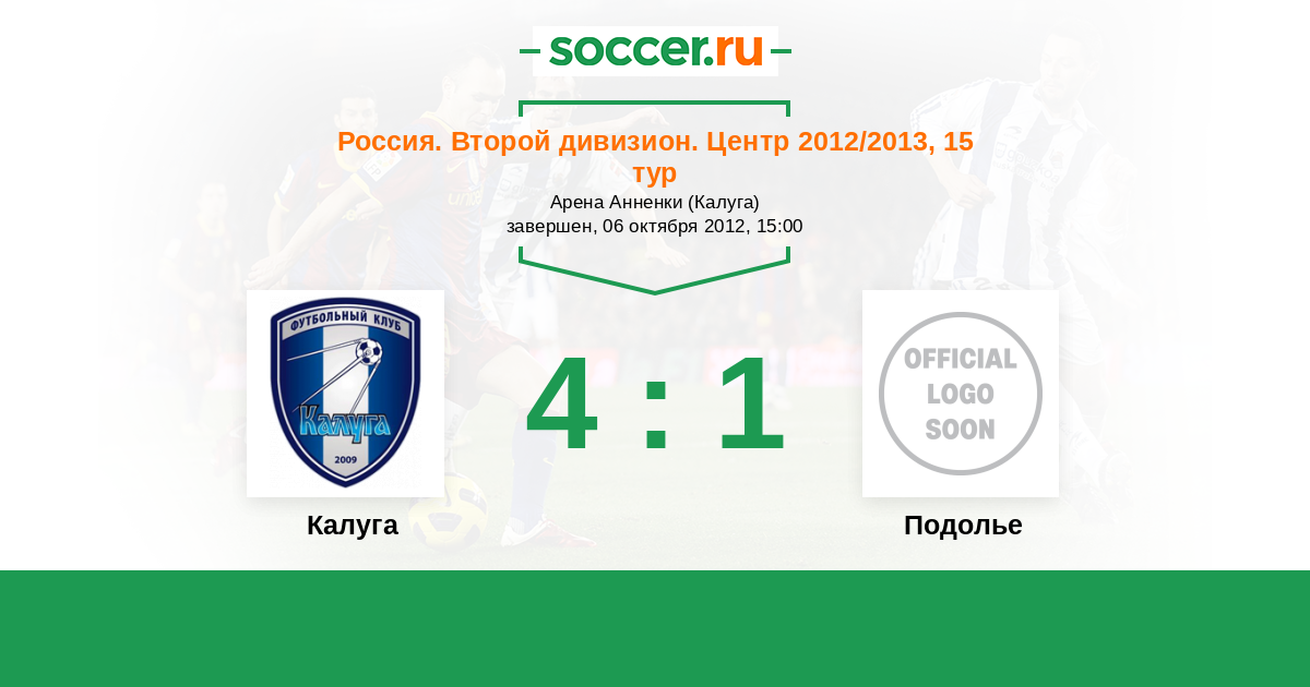 Россия. Вторая лига. Группа 3 05.10.2011 Подолье Логотип футбольный клуб Подолье (Подольский район) 0:1 Логотип футбольный клуб Калуга Калуга