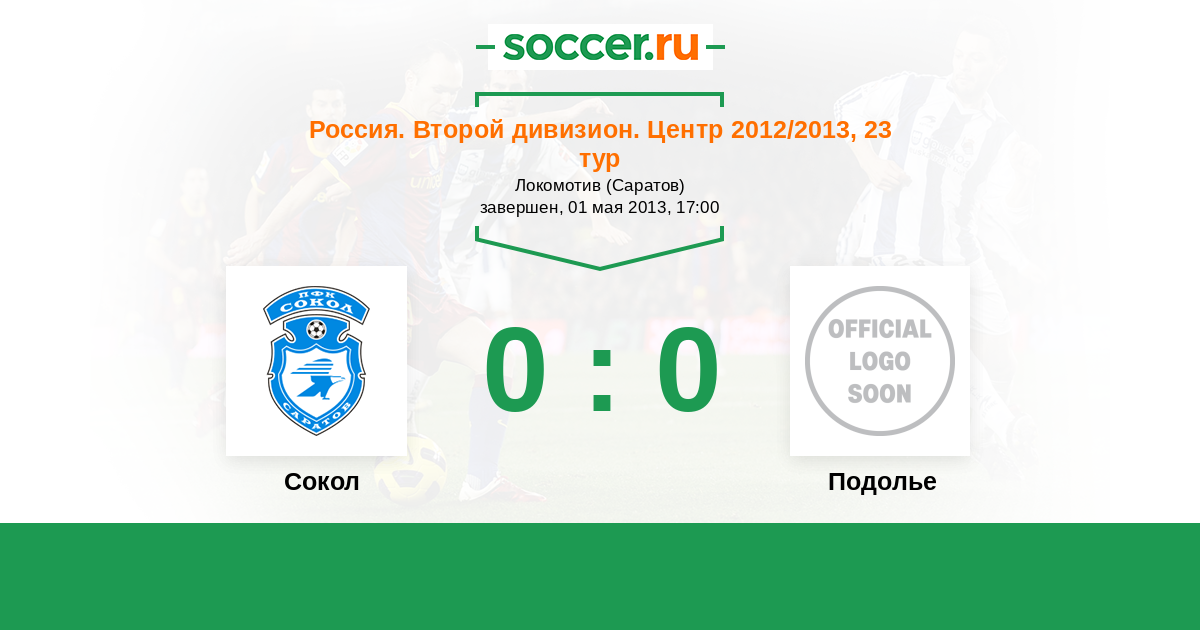Россия. Вторая лига. Группа 3 16.10.2013 Сокол Логотип футбольный клуб Сокол (Саратов) 2:0 Логотип футбольный клуб Подолье (Подольский район) Подолье
