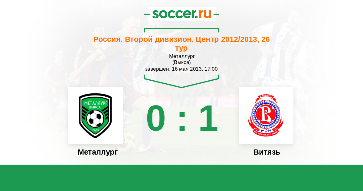 Россия. Вторая лига. Группа 3 19.09.2013 Металлург Логотип футбольный клуб Металлург (Выкса) 0:1 Логотип футбольный клуб Витязь (Подольск) Витязь