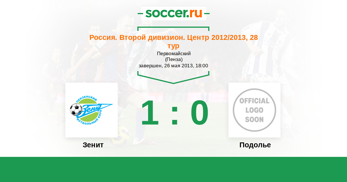 Россия. Вторая лига. Группа 3 30.09.2012 Подолье Логотип футбольный клуб Подолье (Подольский район) 2:1 Логотип футбольный клуб Зенит (Пенза) Зенит