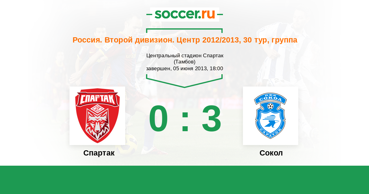 Россия. Вторая лига. Группа 3 17.04.2012 Спартак Логотип футбольный клуб Спартак (Тамбов) 1:1 Логотип футбольный клуб Сокол (Саратов) Сокол