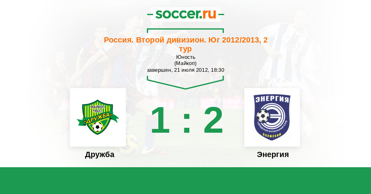Россия. Вторая лига. Группа 1 21.10.2012 Энергия Логотип футбольный клуб Энергия (Волжский) 2:1 Логотип футбольный клуб Дружба (Майкоп) Дружба