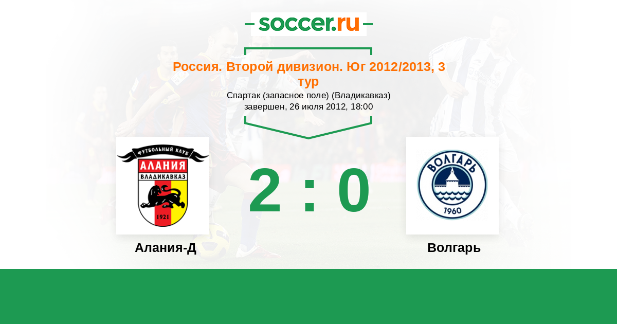 Россия. Вторая лига. Группа 1 25.10.2012 Волгарь Логотип футбольный клуб Волгарь (Астрахань) 0:1 Логотип футбольный клуб Алания-Д (Владикавказ) Алания-Д