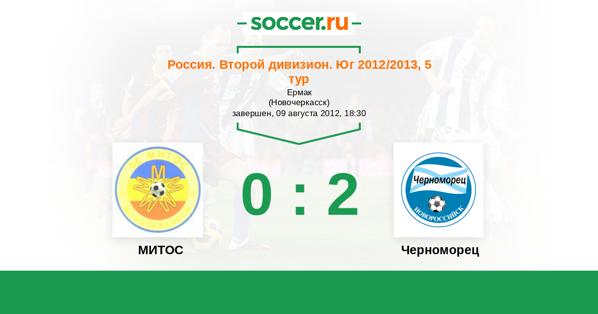 Россия. Вторая лига. Группа 1 07.11.2012 Черноморец Логотип футбольный клуб Черноморец (Новороссийск) 3:2 Логотип футбольный клуб МИТОС (Новочеркасск) МИТОС