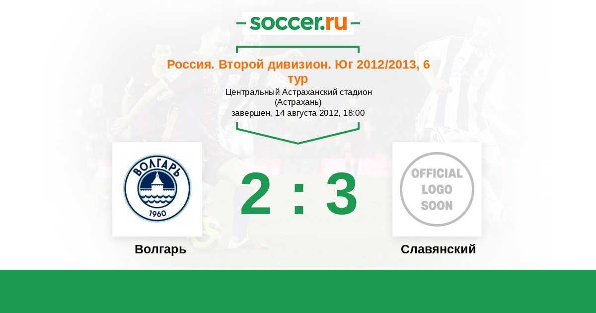Россия. Вторая лига. Группа 1 12.11.2012 Славянский Логотип футбольный клуб Славянский (Славянск-на-Кубани) 3:1 Логотип футбольный клуб Волгарь (Астрахань) Волгарь