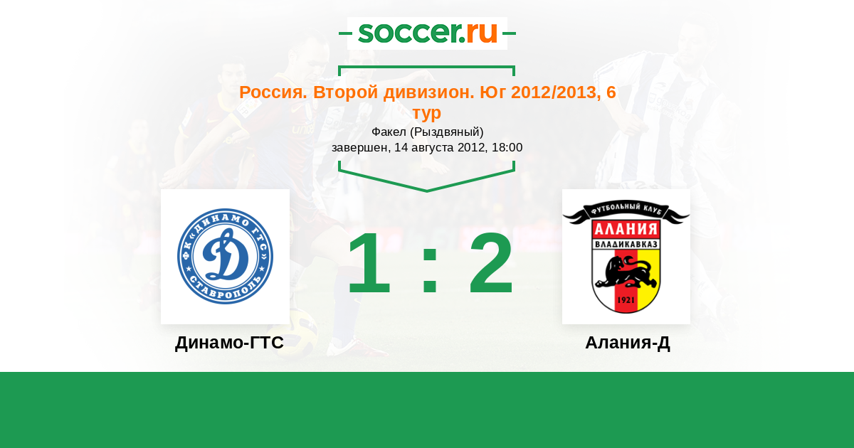 Россия. Кубок 18.08.2012 Кавказтрансгаз-2005 Логотип футбольный клуб Кавказтрансгаз-2005 (Ставрополь) 1:2 Логотип футбольный клуб Алания-Д (Владикавказ) Алания-Д