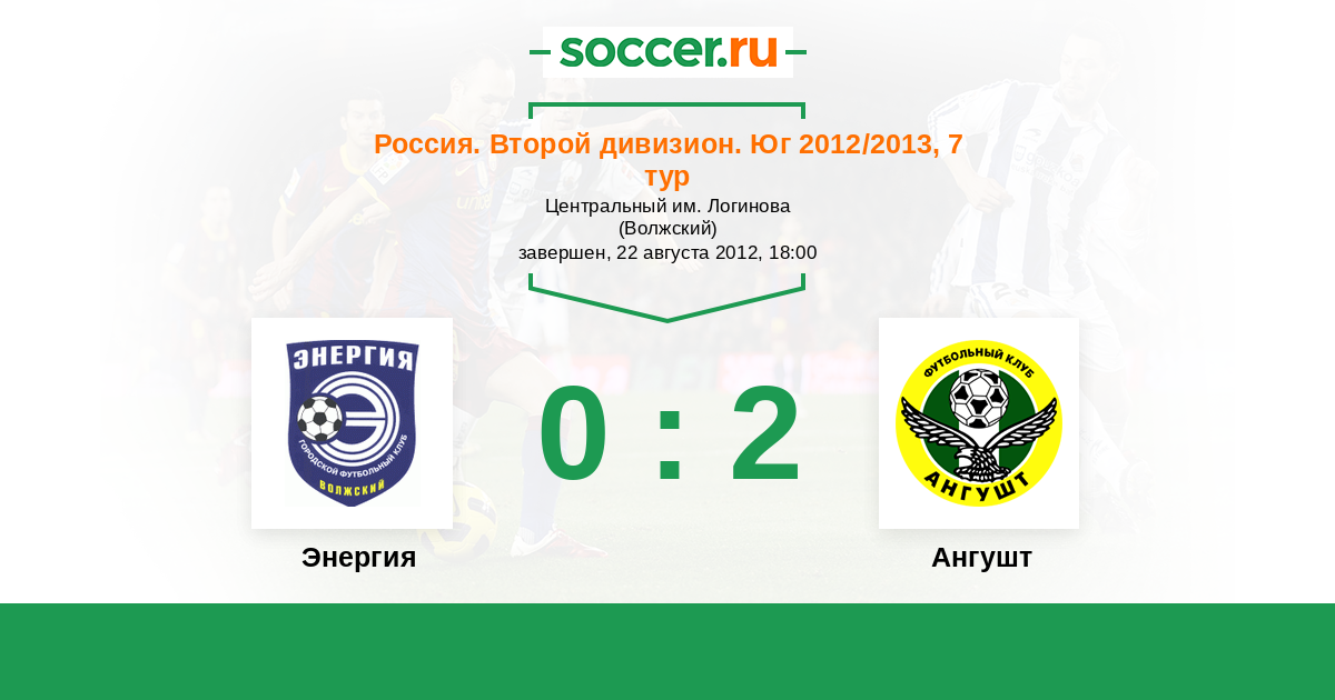Россия. Вторая лига. Группа 1 18.04.2012 Энергия Логотип футбольный клуб Энергия (Волжский) 1:2 Логотип футбольный клуб Ангушт (Назрань) Ангушт