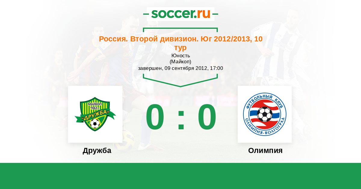 Россия. Вторая лига. Группа 1 28.08.2013 Олимпия Логотип футбольный клуб Олимпия (Волгоград) 5:2 Логотип футбольный клуб Дружба (Майкоп) Дружба