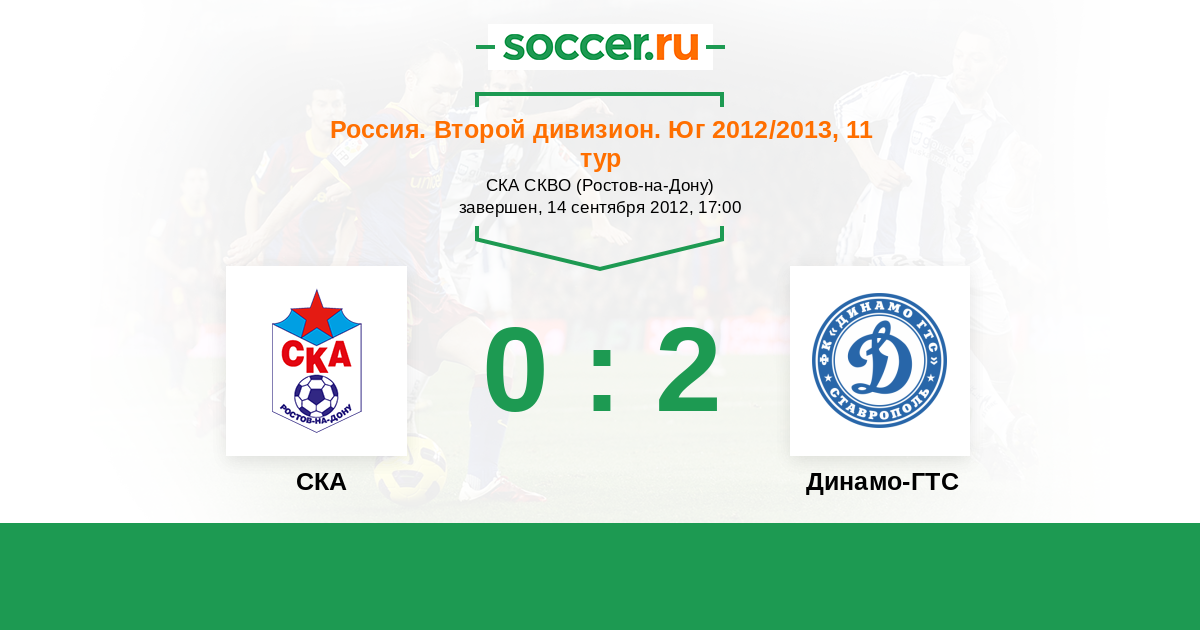 Россия. Вторая лига. Группа 1 14.08.2011 Кавказтрансгаз-2005 Логотип футбольный клуб Кавказтрансгаз-2005 (Ставрополь) 1:2 Логотип футбольный клуб СКА (Ростов-на-Дону) СКА