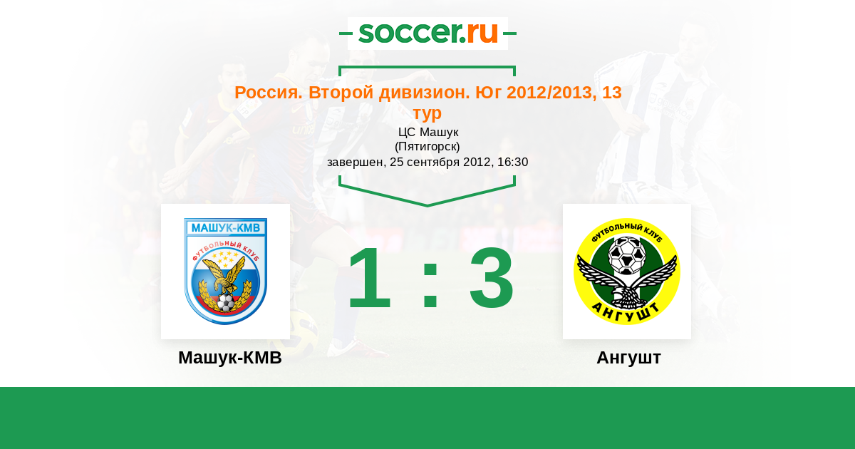 Россия. Вторая лига. Группа 1 11.05.2013 Ангушт Логотип футбольный клуб Ангушт (Назрань) 2:0 Логотип футбольный клуб Машук-КМВ (Пятигорск) Машук-КМВ