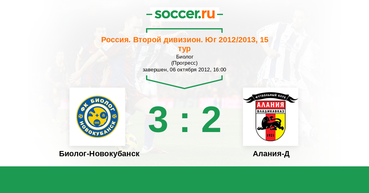 Россия. Вторая лига. Группа 1 30.07.2013 Алания-Д Логотип футбольный клуб Алания-Д (Владикавказ) 1:2 Логотип футбольный клуб Биолог-Новокубанск Биолог-Новокубанск