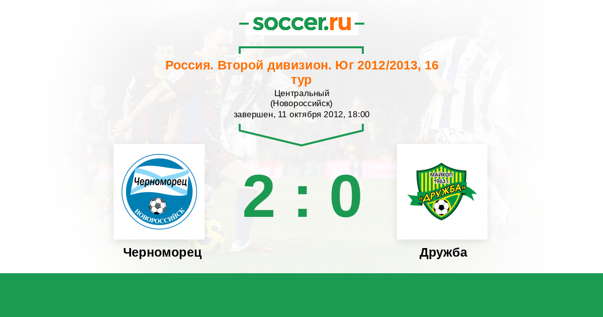 Россия. Вторая лига. Группа 1 07.11.2013 Черноморец Логотип футбольный клуб Черноморец (Новороссийск) 3:0 Логотип футбольный клуб Дружба (Майкоп) Дружба