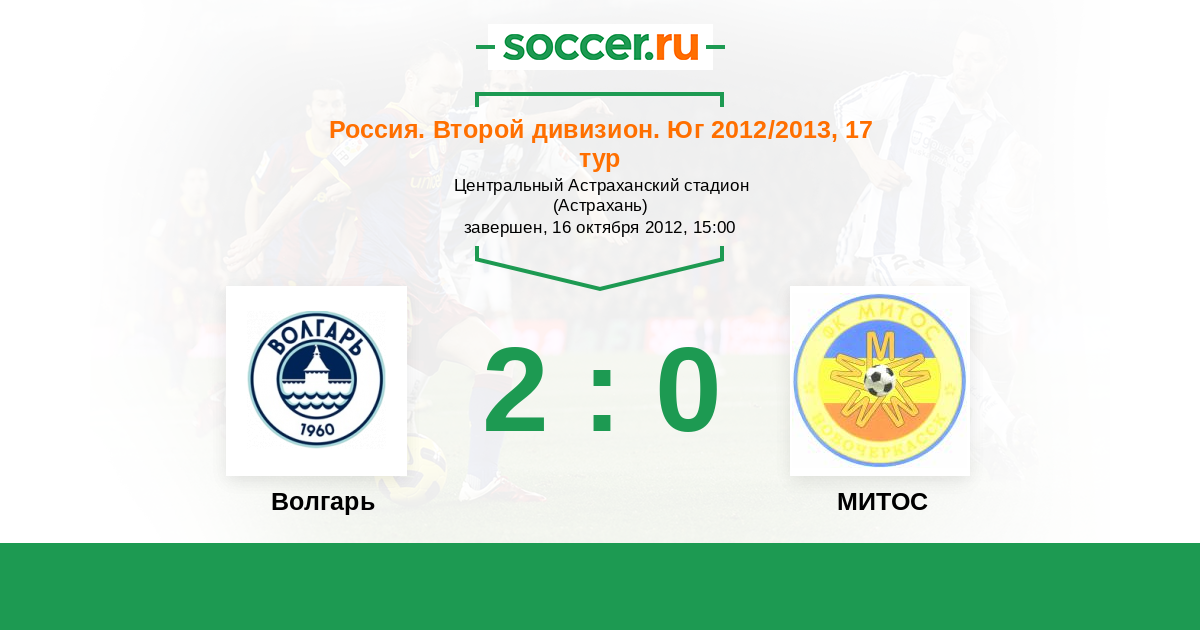 Россия. Вторая лига. Группа 1 31.05.2013 МИТОС Логотип футбольный клуб МИТОС (Новочеркасск) 2:1 Логотип футбольный клуб Волгарь (Астрахань) Волгарь