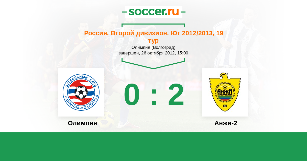 Россия. Вторая лига. Группа 1 26.07.2012 Дагдизель Логотип футбольный клуб Дагдизель (Махачкала) 2:1 Логотип футбольный клуб Олимпия (Волгоград) Олимпия