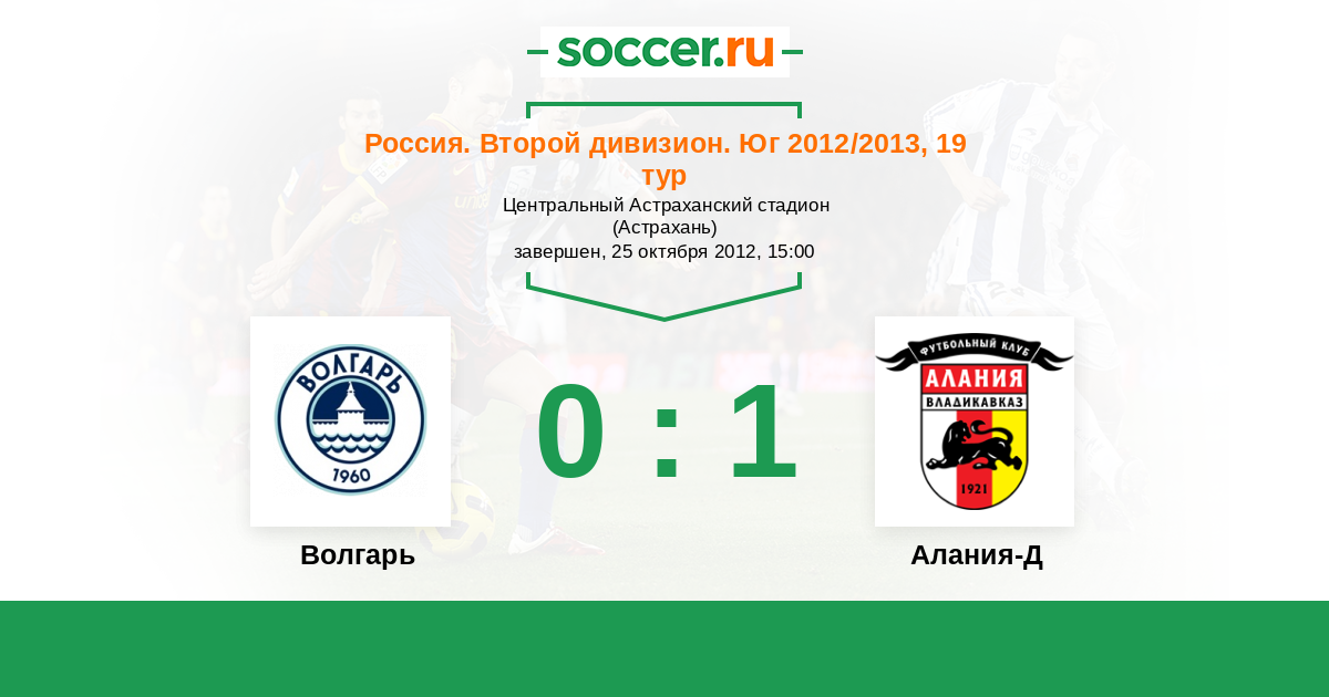 Россия. Вторая лига. Группа 1 26.07.2012 Алания-Д Логотип футбольный клуб Алания-Д (Владикавказ) 2:0 Логотип футбольный клуб Волгарь (Астрахань) Волгарь