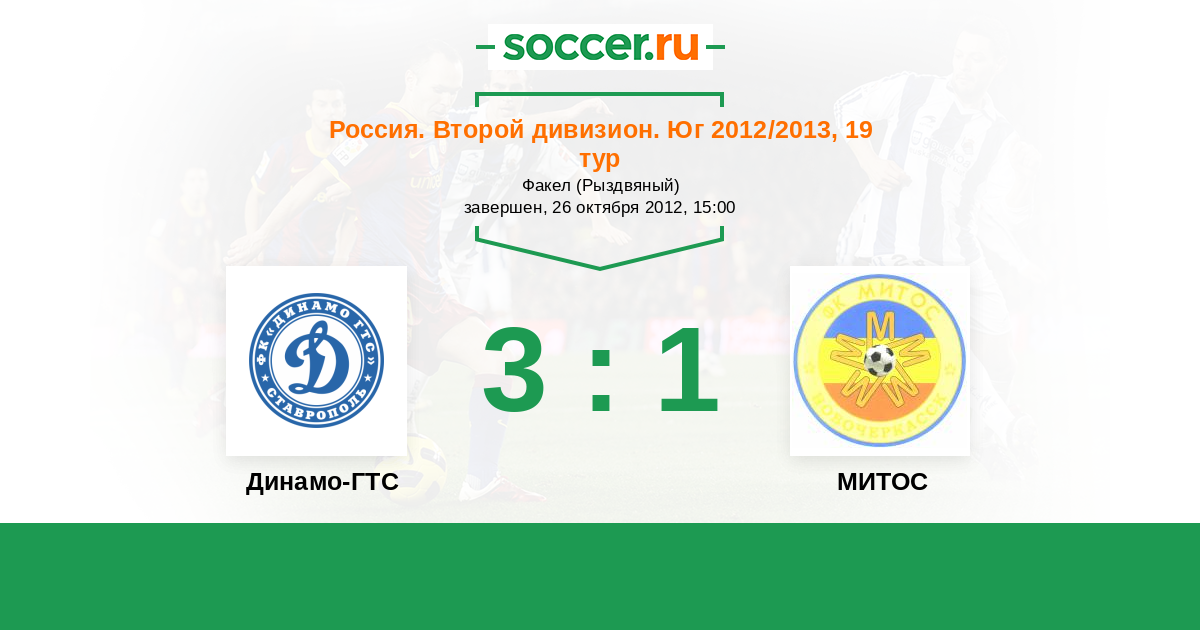 Россия. Вторая лига. Группа 1 13.10.2014 Динамо-ГТС Логотип футбольный клуб Динамо-ГТС (Ставрополь) 1:4 Логотип футбольный клуб МИТОС (Новочеркасск) МИТОС