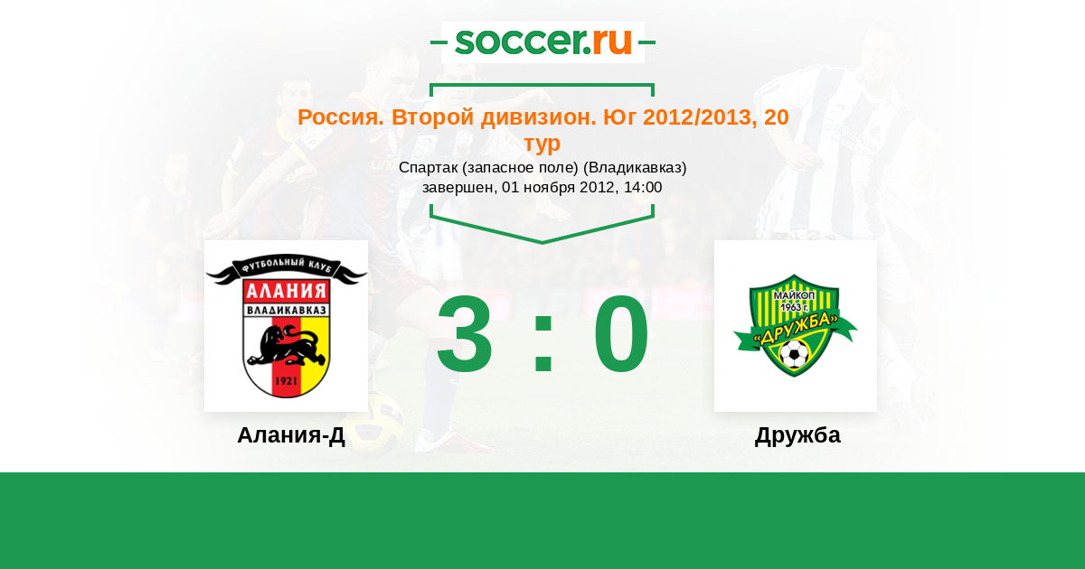 Россия. Вторая лига. Группа 1 31.07.2012 Дружба Логотип футбольный клуб Дружба (Майкоп) 3:1 Логотип футбольный клуб Алания-Д (Владикавказ) Алания-Д