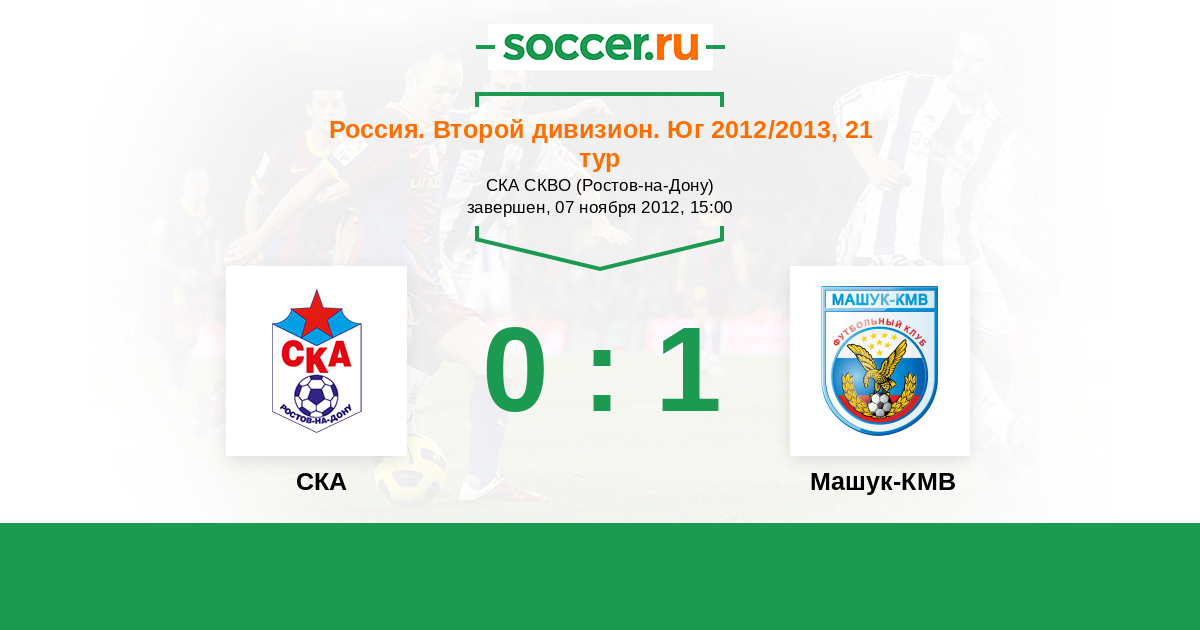 Россия. Вторая лига. Группа 1 09.08.2012 Машук-КМВ Логотип футбольный клуб Машук-КМВ (Пятигорск) 2:0 Логотип футбольный клуб СКА (Ростов-на-Дону) СКА