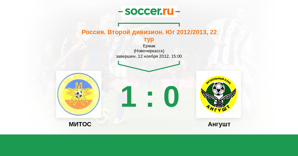 Россия. Вторая лига. Группа 1 14.08.2012 Ангушт Логотип футбольный клуб Ангушт (Назрань) 1:1 Логотип футбольный клуб МИТОС (Новочеркасск) МИТОС