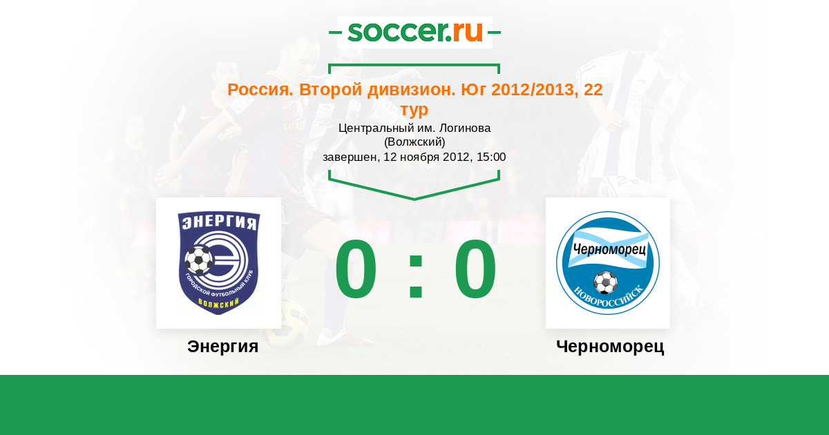 Россия. Вторая лига. Группа 1 14.08.2012 Черноморец Логотип футбольный клуб Черноморец (Новороссийск) 2:0 Логотип футбольный клуб Энергия (Волжский) Энергия