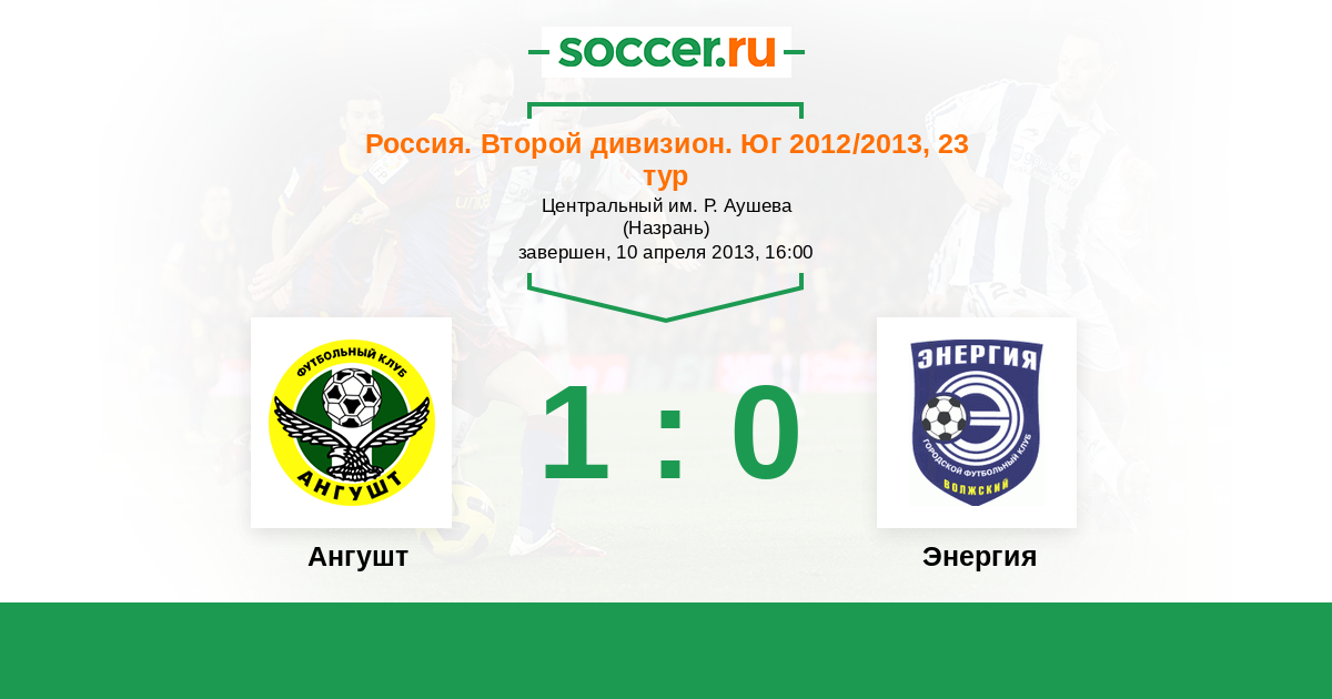 Россия. Вторая лига. Группа 1 18.04.2012 Энергия Логотип футбольный клуб Энергия (Волжский) 1:2 Логотип футбольный клуб Ангушт (Назрань) Ангушт