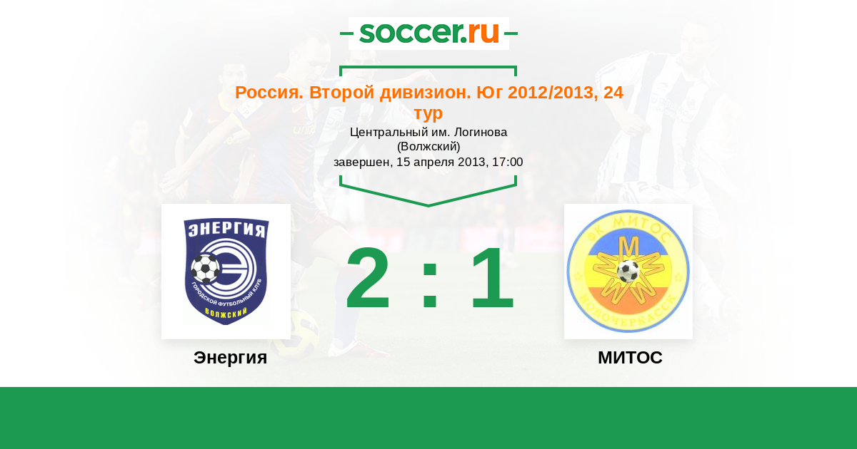 Россия. Вторая лига. Группа 1 07.05.2012 МИТОС Логотип футбольный клуб МИТОС (Новочеркасск) 1:1 Логотип футбольный клуб Энергия (Волжский) Энергия