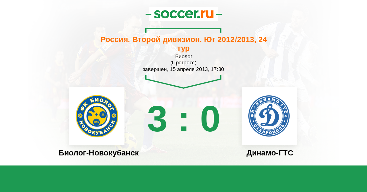 Россия. Вторая лига. Группа 1 10.04.2014 Биолог-Новокубанск Логотип футбольный клуб Биолог-Новокубанск 1:2 Логотип футбольный клуб Газпром-Трансгаз-Ставрополь Газпром-Трансгаз-Ставрополь