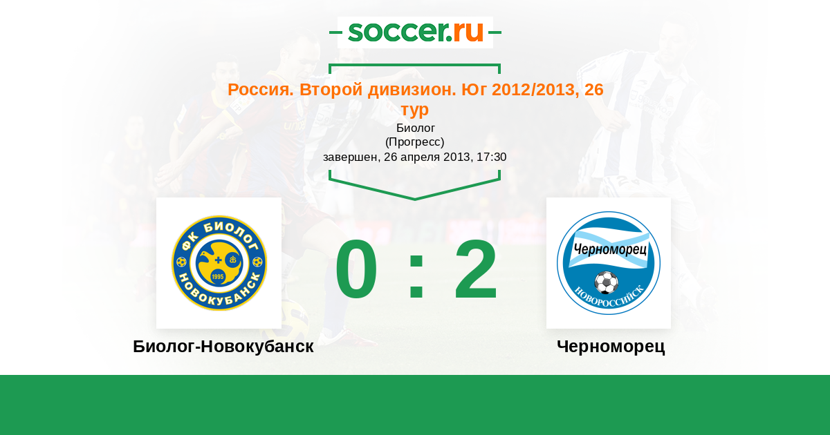Россия. Вторая лига. Группа 1 29.09.2013 Черноморец Логотип футбольный клуб Черноморец (Новороссийск) 1:0 Логотип футбольный клуб Биолог-Новокубанск Биолог-Новокубанск