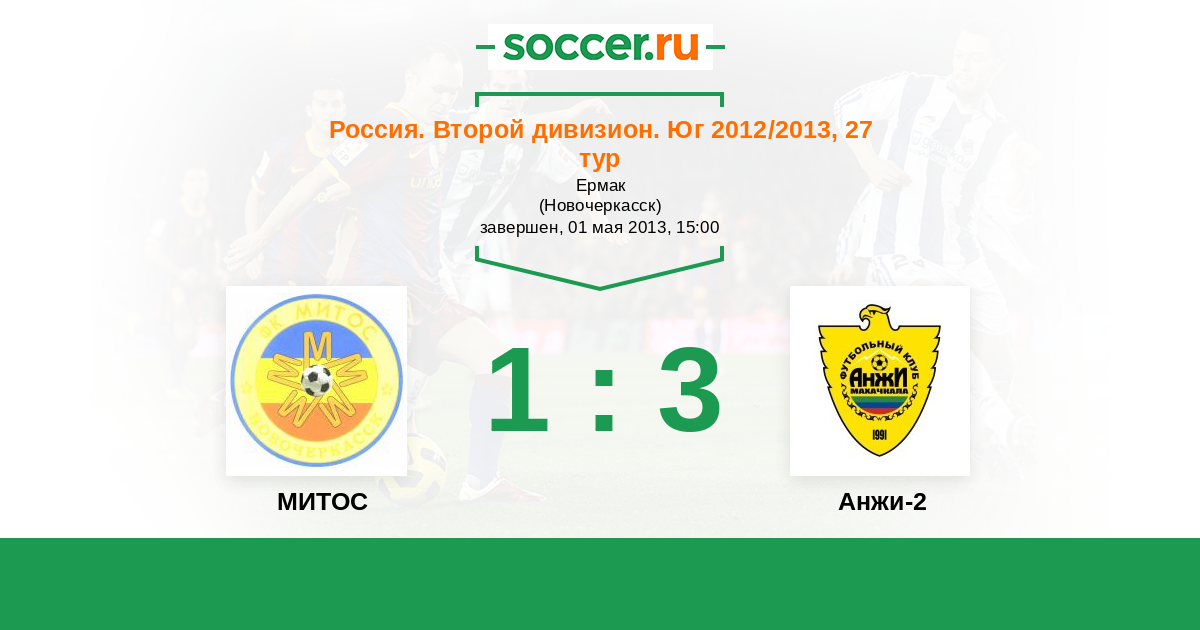 Россия. Вторая лига. Группа 1 19.09.2014 Анжи-2 Логотип футбольный клуб Анжи-2 (Махачкала) 0:1 Логотип футбольный клуб МИТОС (Новочеркасск) МИТОС