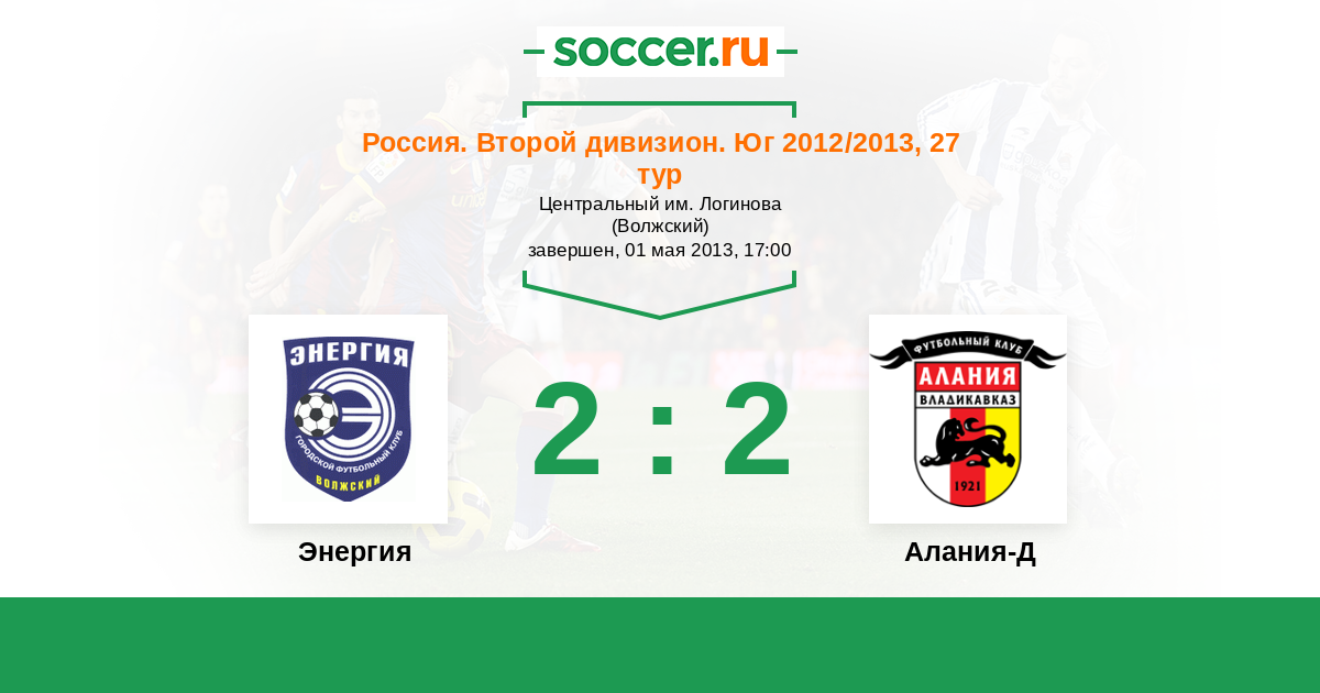 Россия. Вторая лига. Группа 1 24.09.2013 Энергия Логотип футбольный клуб Энергия (Волжский) 0:3 Логотип футбольный клуб Алания-Д (Владикавказ) Алания-Д