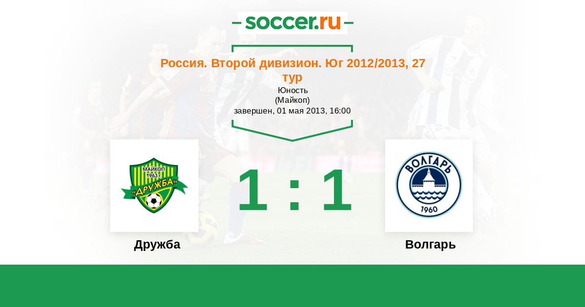 Россия. Вторая лига. Группа 1 14.09.2012 Волгарь Логотип футбольный клуб Волгарь (Астрахань) 1:3 Логотип футбольный клуб Дружба (Майкоп) Дружба