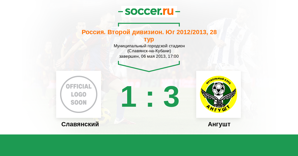 Россия. Вторая лига. Группа 1 06.05.2013 Славянский Логотип футбольный клуб Славянский (Славянск-на-Кубани) 1:3 Логотип футбольный клуб Ангушт (Назрань) Ангушт