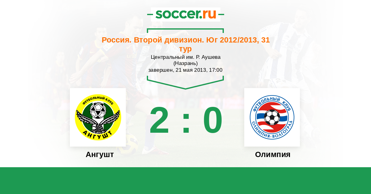 Россия. Вторая лига. Группа 1 06.10.2012 Олимпия Логотип футбольный клуб Олимпия (Волгоград) 1:3 Логотип футбольный клуб Ангушт (Назрань) Ангушт