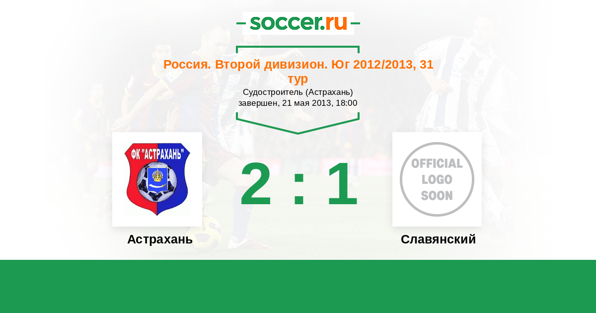 Россия. Вторая лига. Группа 1 21.05.2013 Астрахань Логотип футбольный клуб Астрахань 2:1 Логотип футбольный клуб Славянский (Славянск-на-Кубани) Славянский