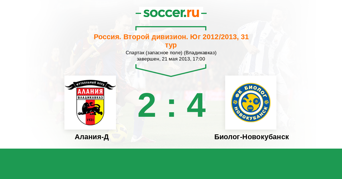 Россия. Вторая лига. Группа 1 30.07.2013 Алания-Д Логотип футбольный клуб Алания-Д (Владикавказ) 1:2 Логотип футбольный клуб Биолог-Новокубанск Биолог-Новокубанск