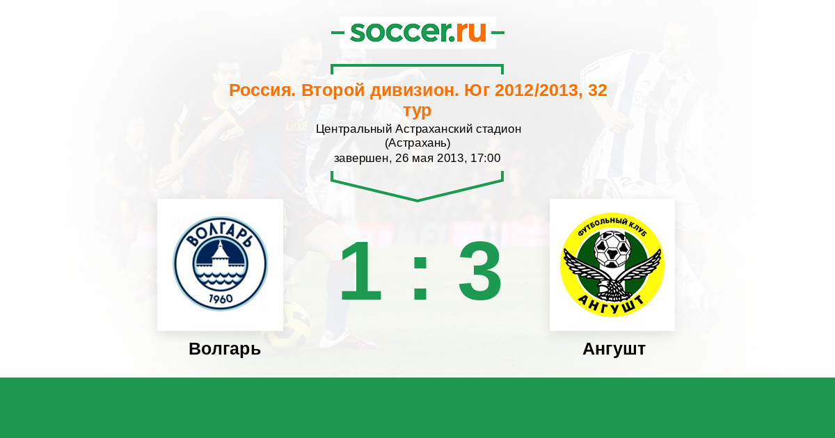 Россия. Вторая лига. Группа 1 11.10.2012 Ангушт Логотип футбольный клуб Ангушт (Назрань) 2:1 Логотип футбольный клуб Волгарь (Астрахань) Волгарь
